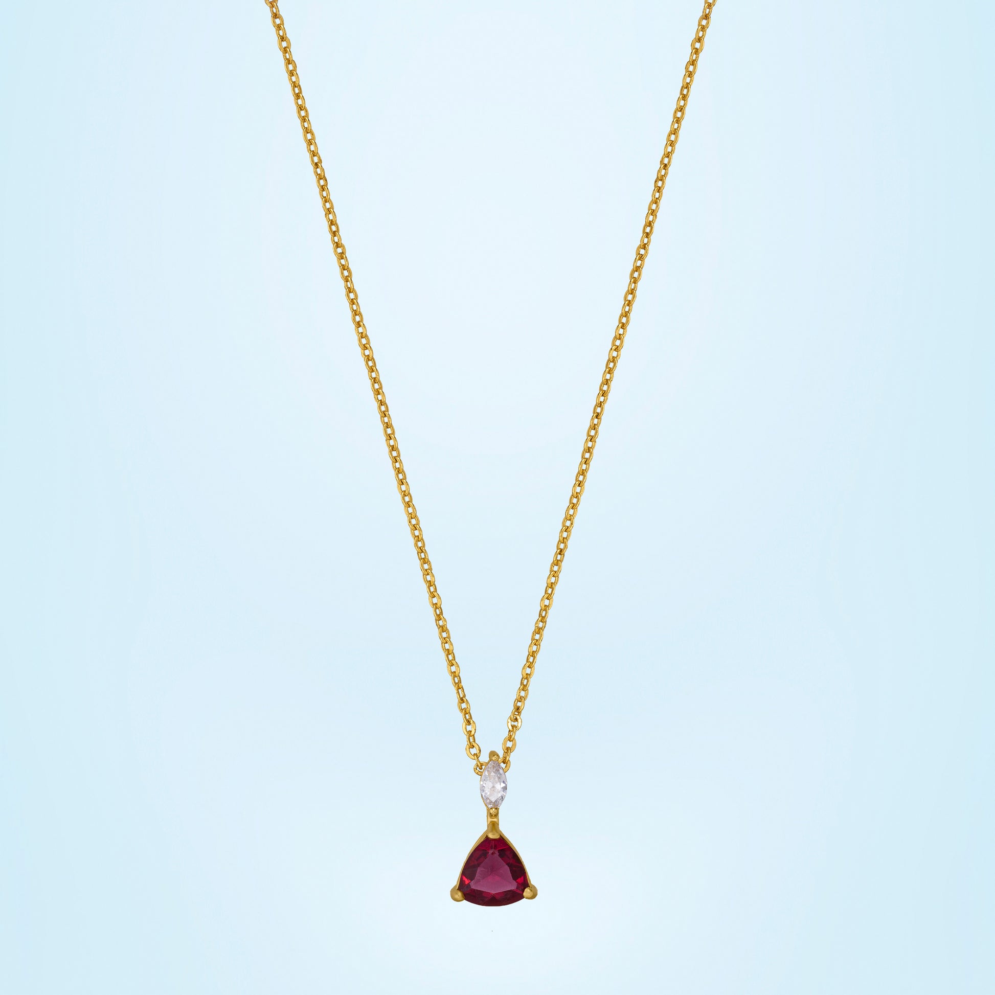 Sleek gold chain featuring a deep ruby-red stone paired with a sparkling zircon drop for a refined finish.