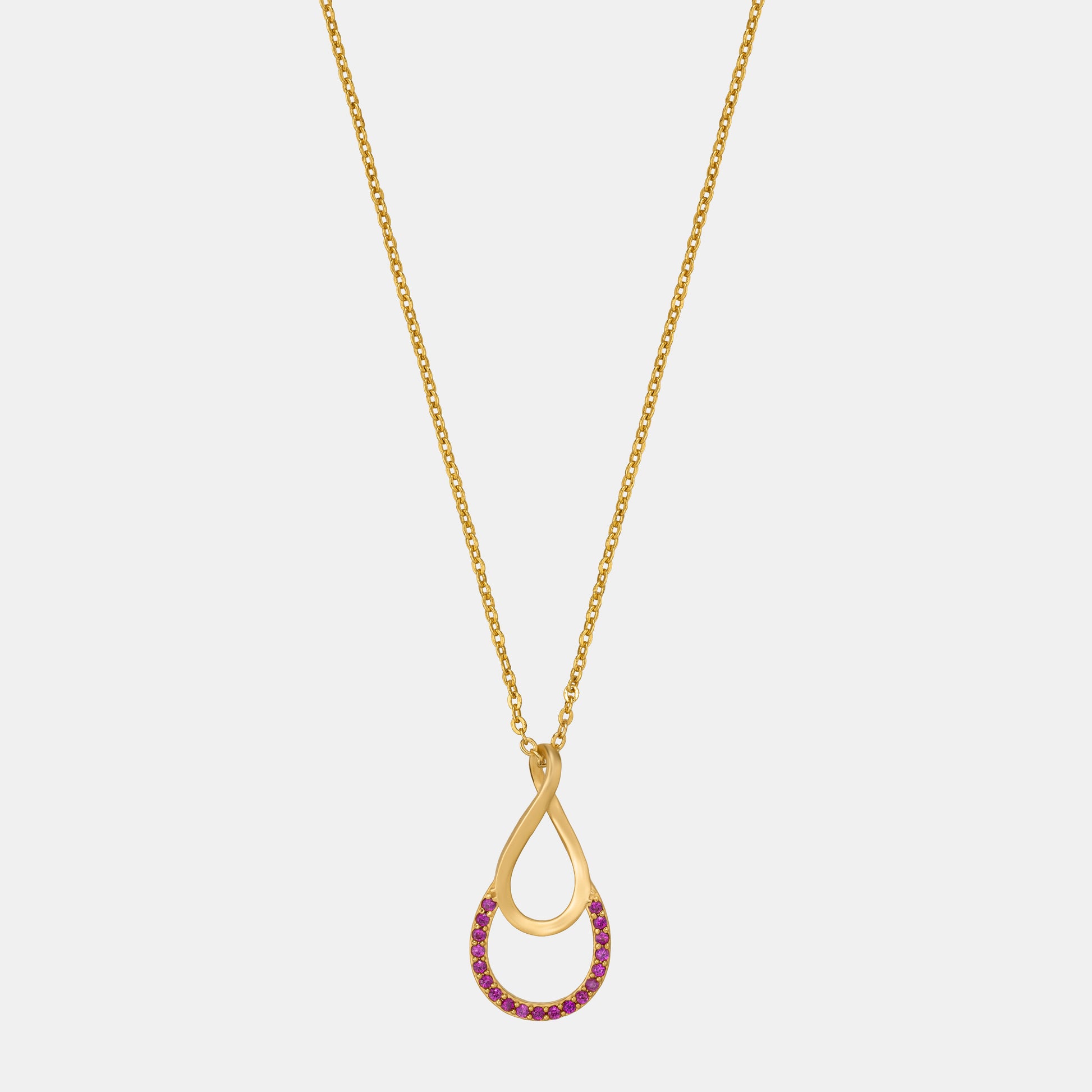 Sleek gold-finish pendant featuring an elegant loop design, half adorned with sparkling zircons for a graceful shimmer.