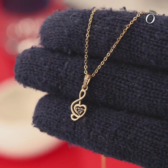 Pendant features a treble clef gracefully paired with a heart, representing both music and love. Crafted from hypoallergenic German silver and adorned with sparkling cubic zirconia stones, it’s finished with 24-carat gold plating for a touch of luxury.