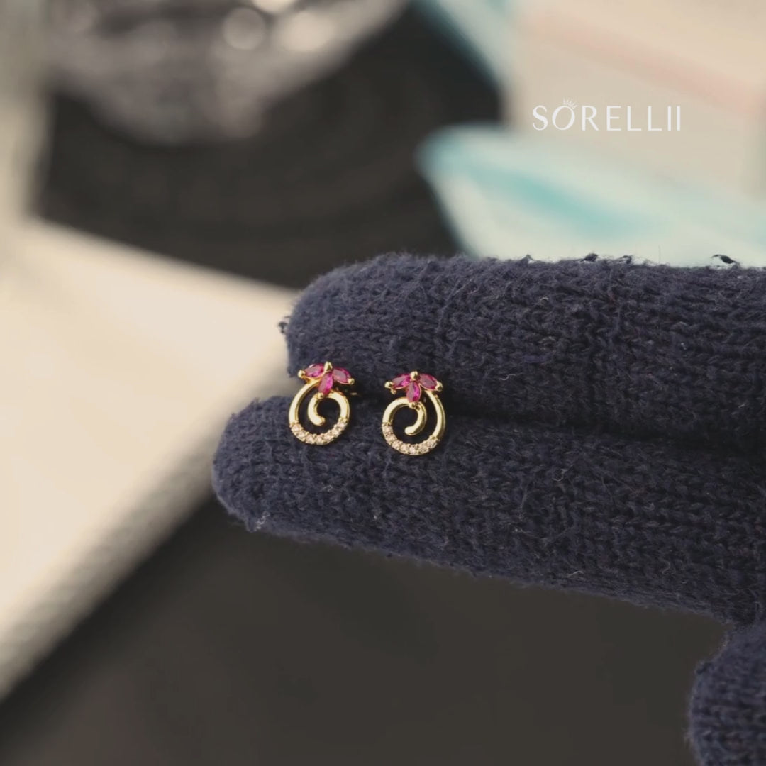 Blossom Vine Earrings feature a delicate floral motif paired with a vine-inspired design,highlighted by sparkling zircons and a bold red stone.