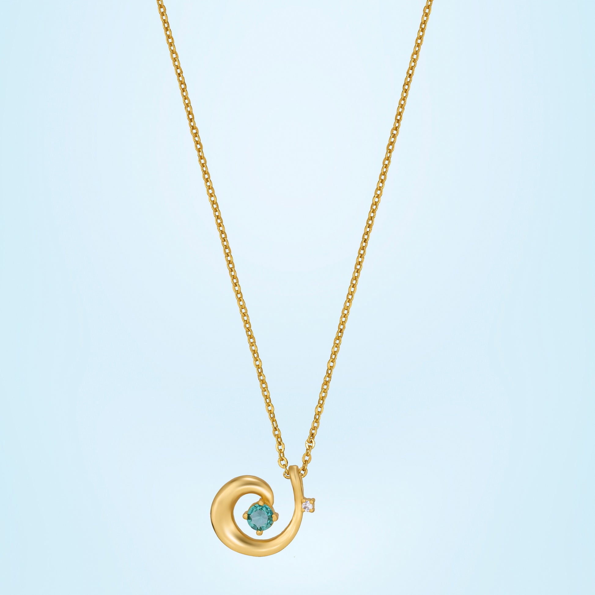 Pendant features a radiant amethyst cubic zirconia at the center, surrounded by a flowing spiral design, all plated with luxurious 24ct gold