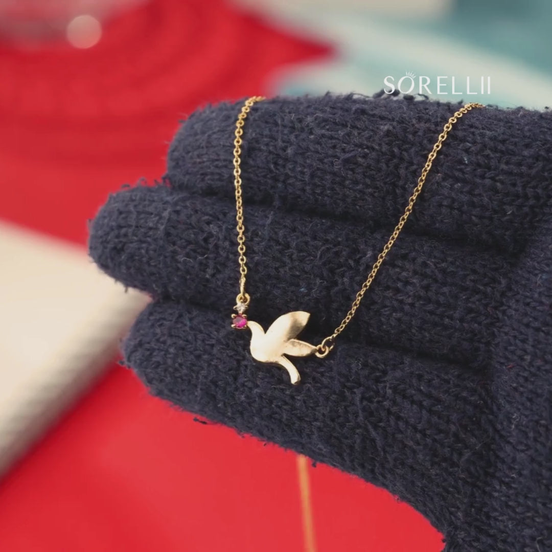 Bird pendant features a red cubic zirconia stone, adding a pop of color to the minimalist design. Crafted from hypoallergenic German silver and plated with 24ct gold, this necklace blends sophistication with simplicity.